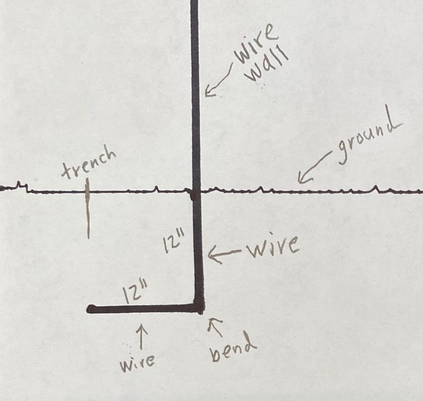 One effective way to prevent digging is burying wire. I can’t draw, but below is a crude drawing. Essentially. you dig a trench 12″ deep by 12″ wide before building the aviary. You bend 12″ of the bottom of the wire by 90 degrees. Then you bury the wire with the bend pointing outwards.