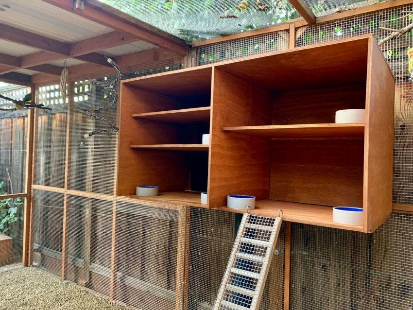 I have my own outdoor aviary in Northern California that has the following features: