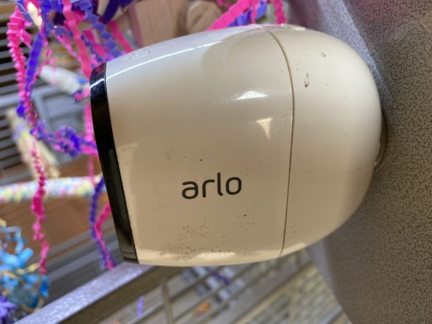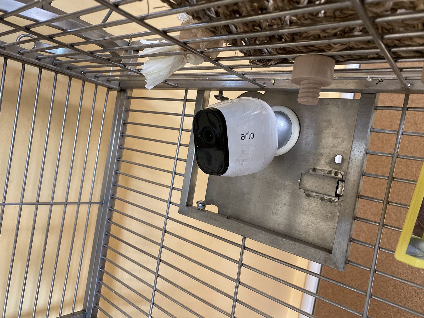 I’ve developed four different methods to attach an Arlo camera inside a cage that I’ll describe here. I’ll mention that I’ve never had problems with any of them, but some theoretically have some risk involved of a camera getting detached.