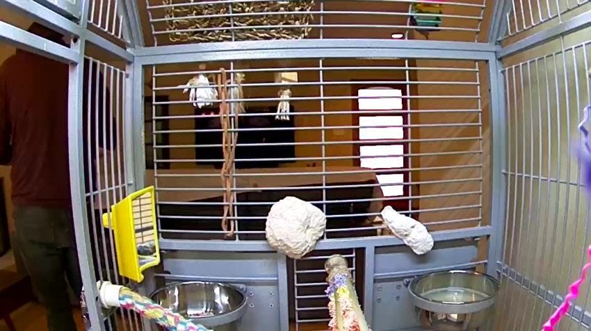 Anytime a camera is in the cage, you’re going to miss whatever is near the camera and only cover part of the cage. In this case, though, I can get a good view of the food and water bowl and some of the perches.
