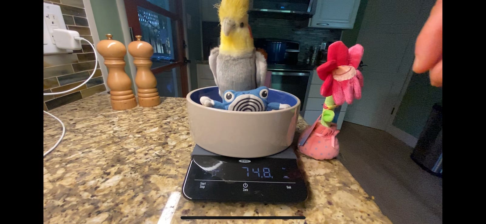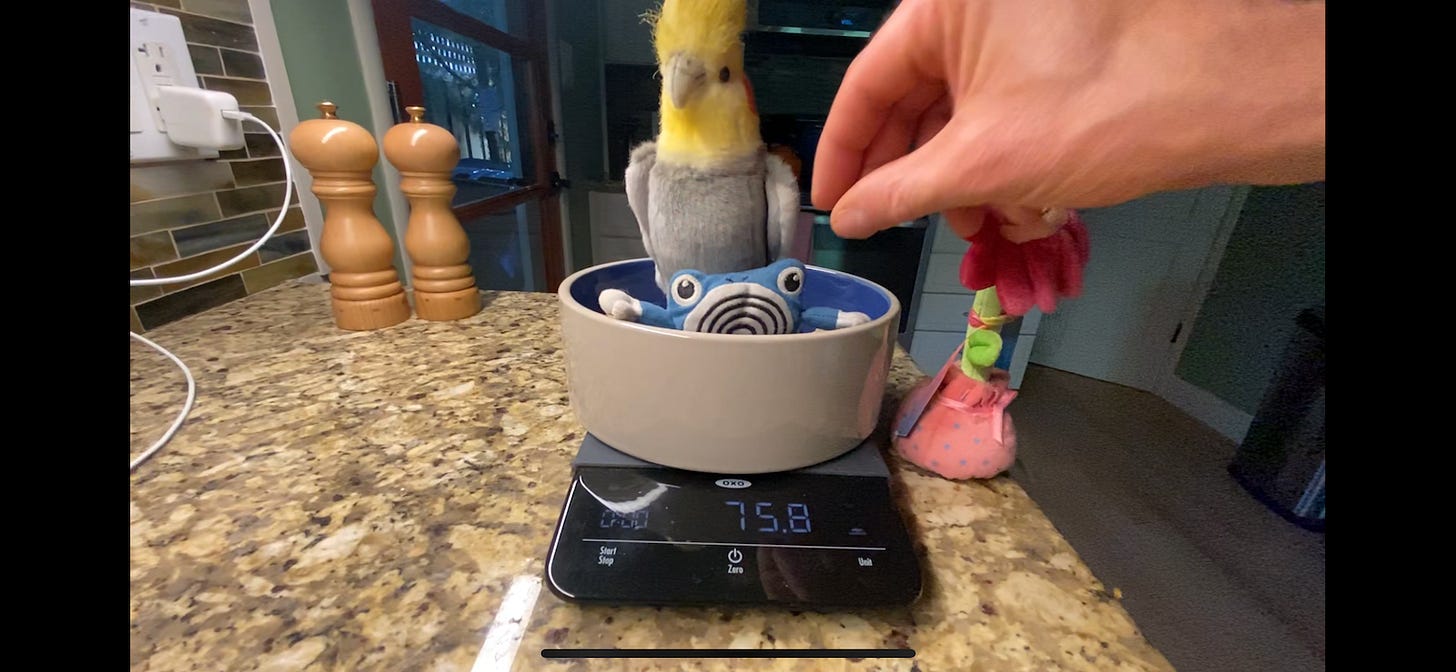 Polywhirl and Plush Cockatiel ate food, resetting Plush Cockatiel baseline weight to 56.8g